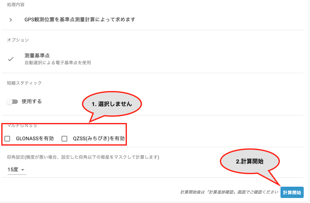 A2: 複数の衛星システム(エアロボクラウドではGPS, GLONASS, みちびき)を同時に使用すると、測位精度が向上するように思えますが、特に理由がない限り「GPS」のみの使用を推奨します。これは、異なる衛星システム間での測位方式や信号特性の違いが、かえって基線解析の精度に悪影響を及ぼす可能性があるためです。特定の目的や環境下で複数のシステムを併用するメリットがある場合を除き、安定した高精度な測位のためには、最も実績があり信頼性の高い「GPS」単独での使用が推奨されます。